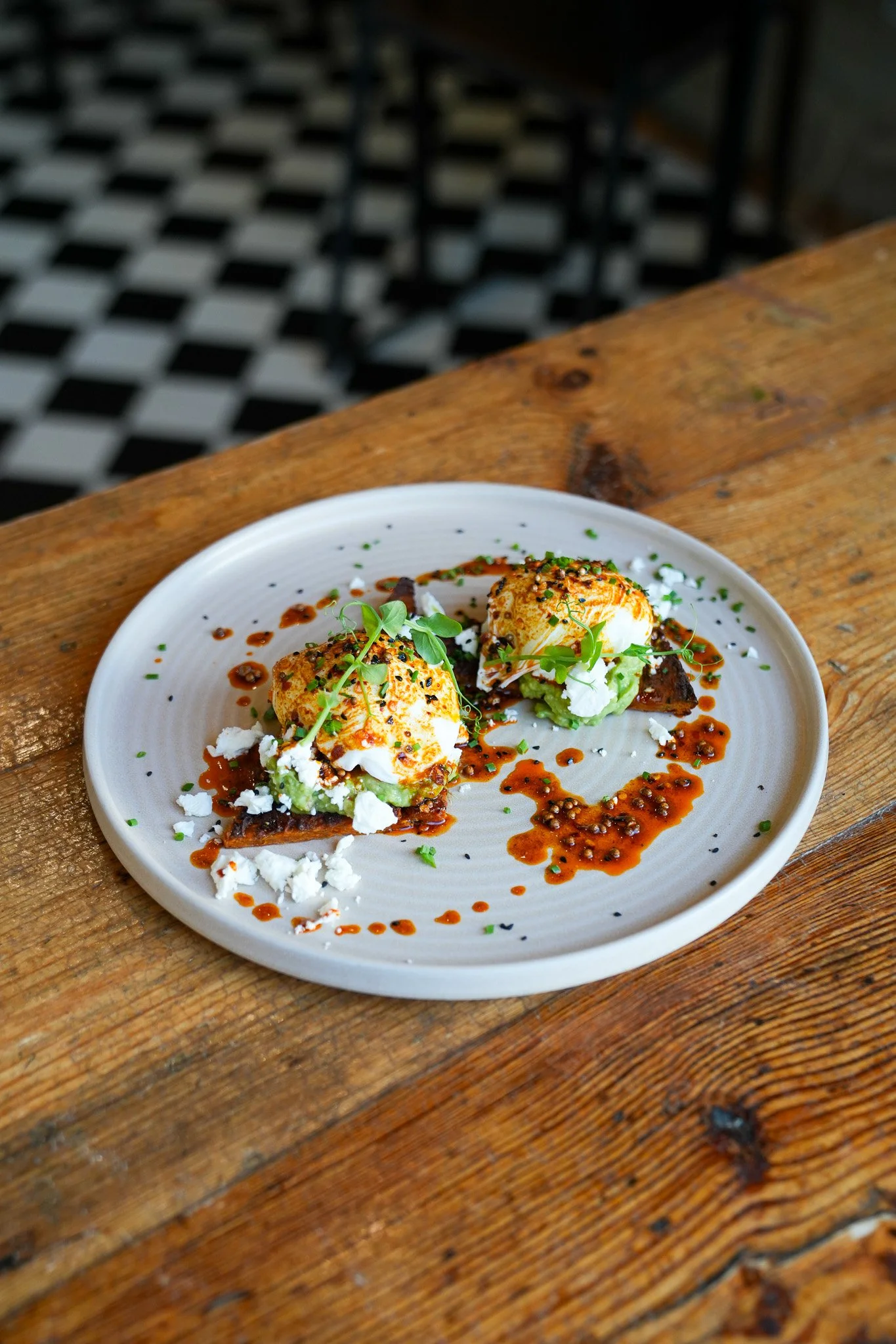 Sweet potato rösti (GF) €16.9 Sweet potato rösti with smashed avocado, crumbed feta and two poached eggs topped with aleppo butter. Contains eggs, dairy.