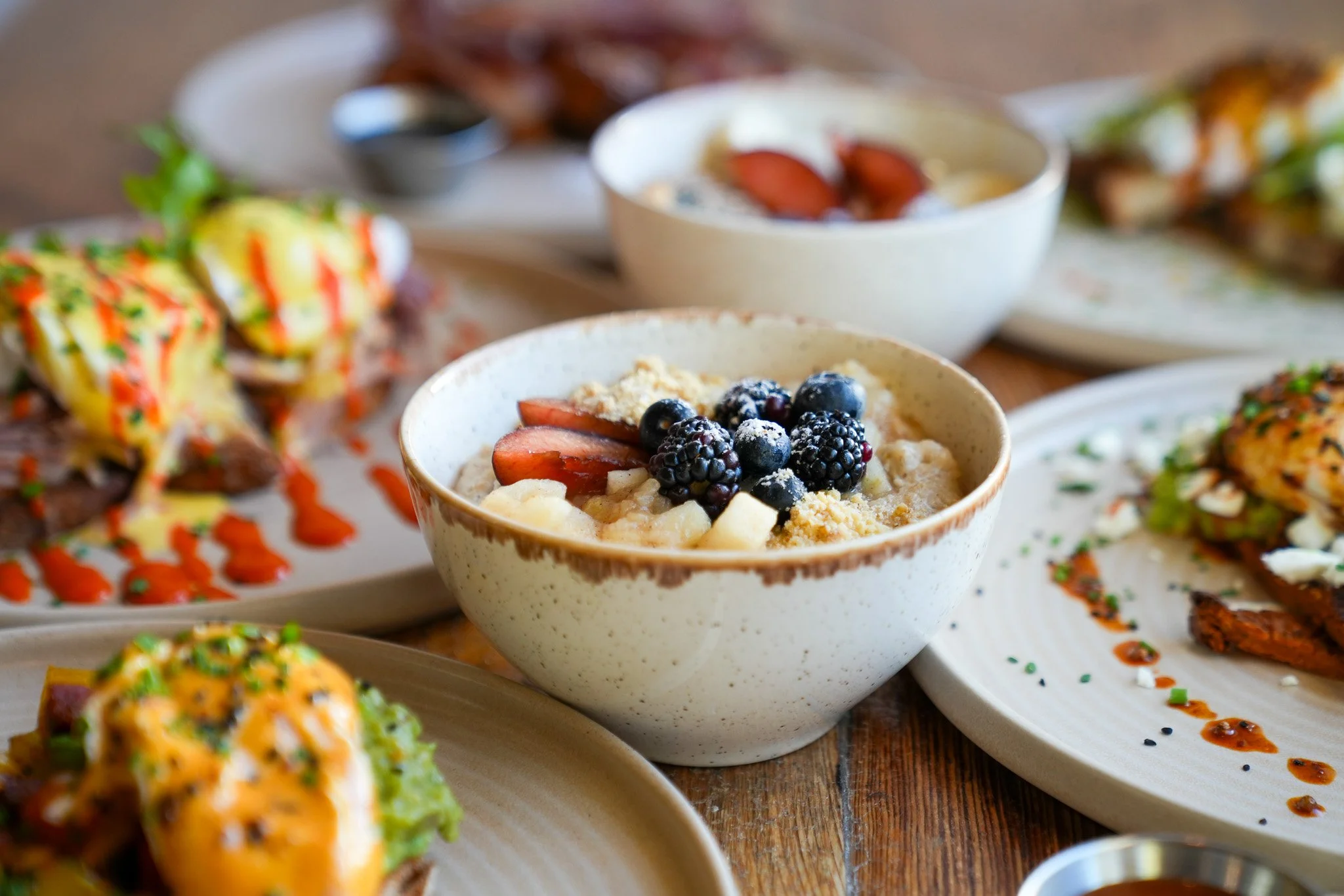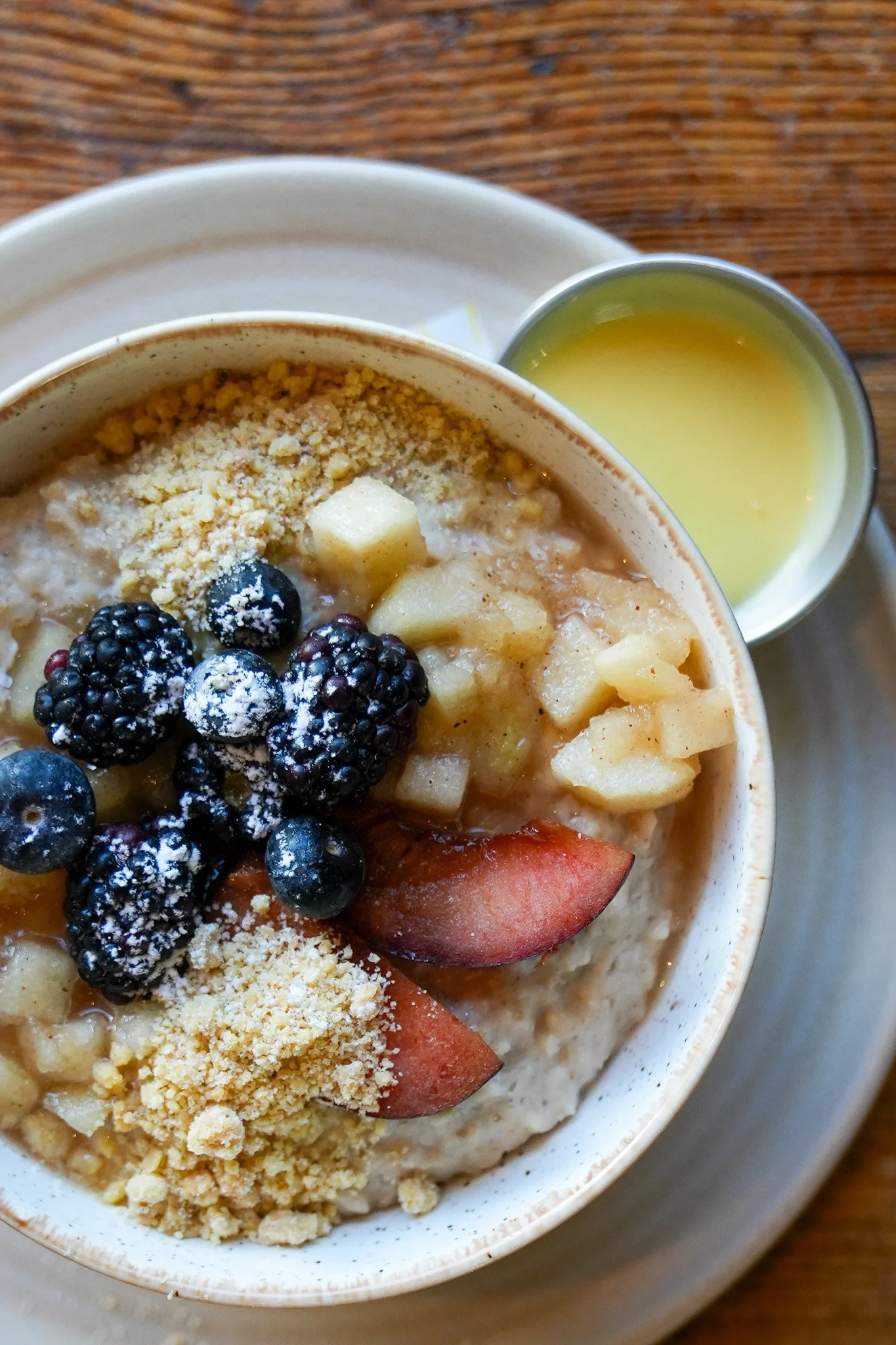 GFTS Porridge €8.5 Stewed spiced apple, blackberry, crumble and house custard (GF option available). Contains gluten, egg, dairy. Add Peanut Butter €1.5